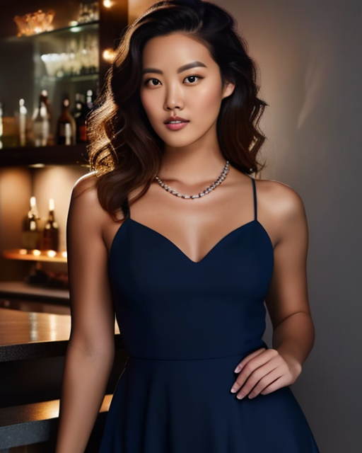 a beautiful, hot girl at a party bar, wearing a mini navy coloured dress, standing against a well stocked bar, seductive smile, wearing beautiful jewellery, and black high heels, bar is darkly lit, toned stunning body, ((hyper realism)), smokey make-up, open hair in loose waves, ((full body)), doing different poses and wearing different clothes in each photo