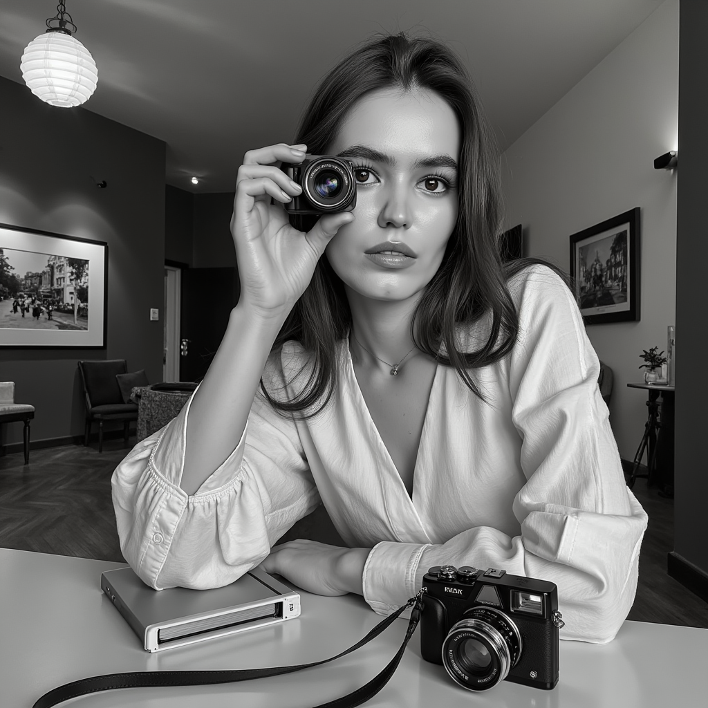 Classic black and white headshot of a focused photographer peering through the viewfinder, timeless expression, elegant lighting, World Photography Day concept