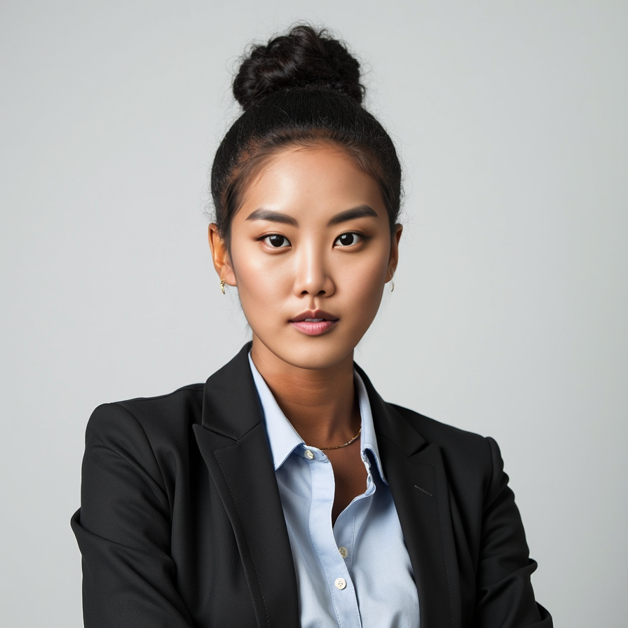 A passport-size photo of a professionally dressed individual, wearing a collared shirt and blazer. The background is plain light gray, the subject is centered and looking directly at the camera with a neutral expression. Lighting is balanced with no shadows or reflections