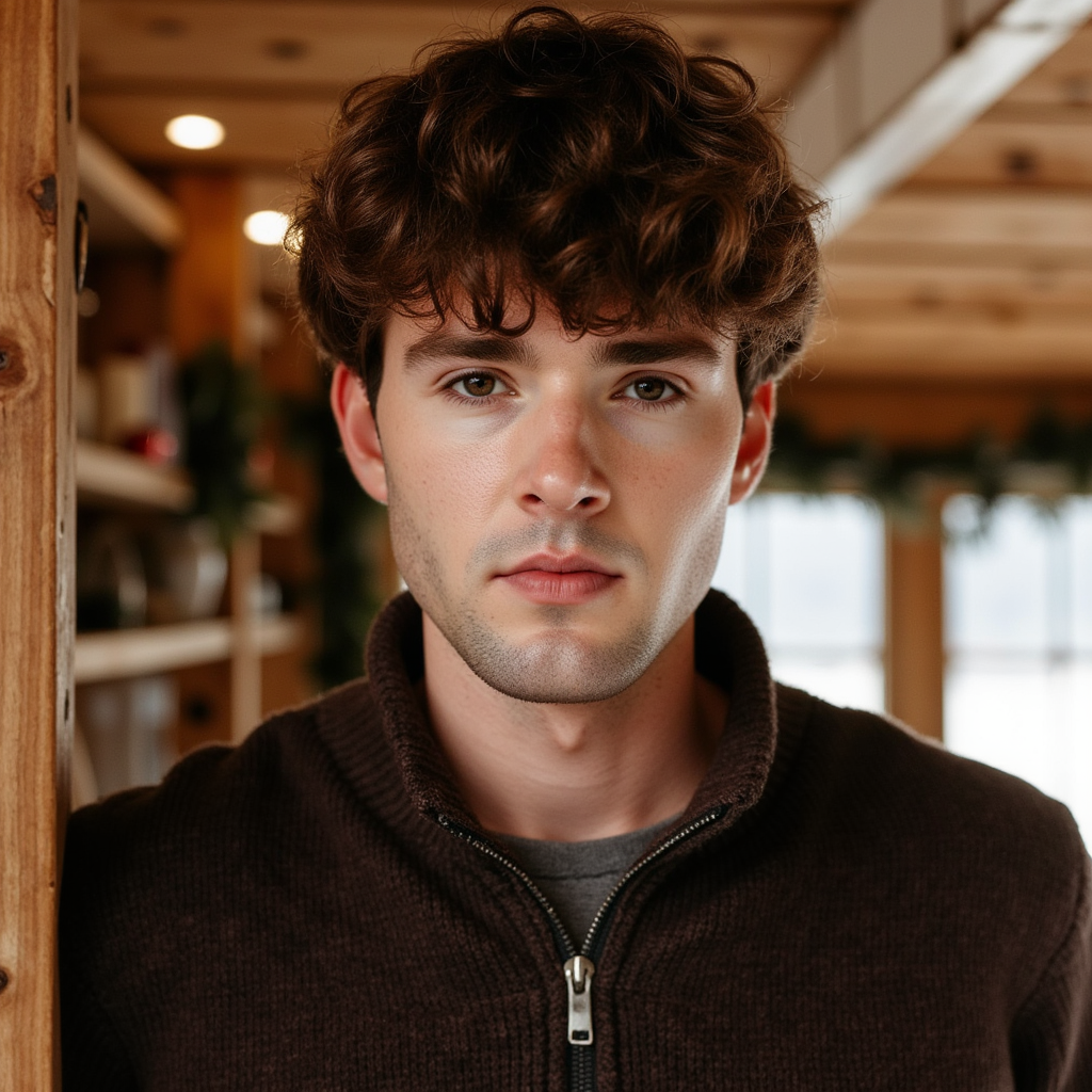Waist-up portrait of a man inside a wooden cabin decked with subtle Christmas décor. He leans lightly against a wooden beam, hands relaxed at his sides, calm stillness. He wears a dark brown lambswool quarter-zip sweater with visible fiber fuzz, zipper glinting softly. Hair: messy textured waves; short beard. Lighting: warm cabin lantern light from camera-left, with a cooler outdoor window glow from behind for…