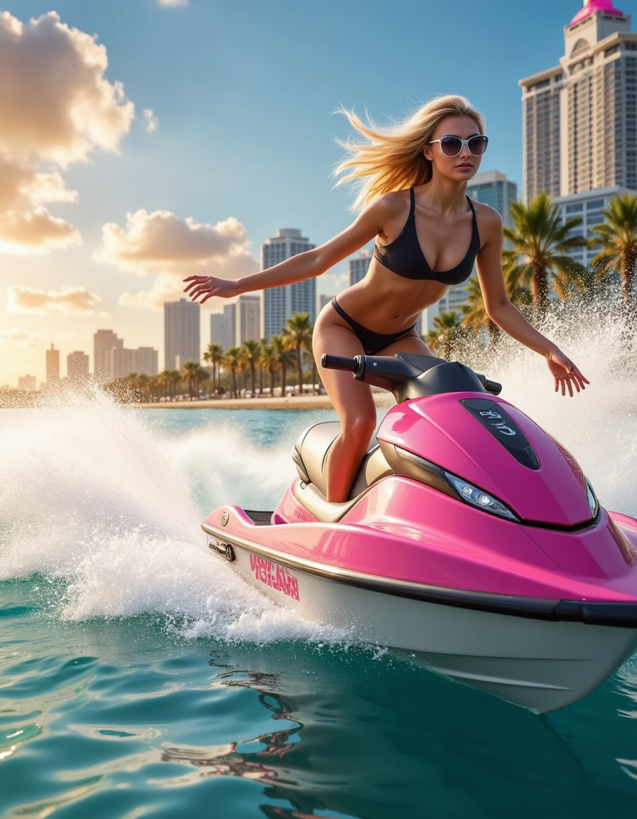 A woman roller-skating down a pastel-colored Miami street during golden hour, with soft sun flares and neon reflections in shop windows, dreamy and cinematic