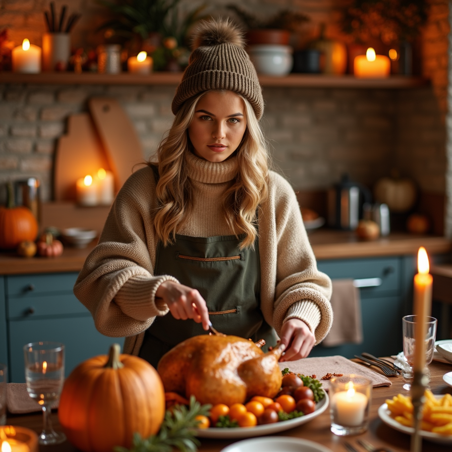 Woman preparing Thanksgiving meal, cozy kitchen, autumn decor.