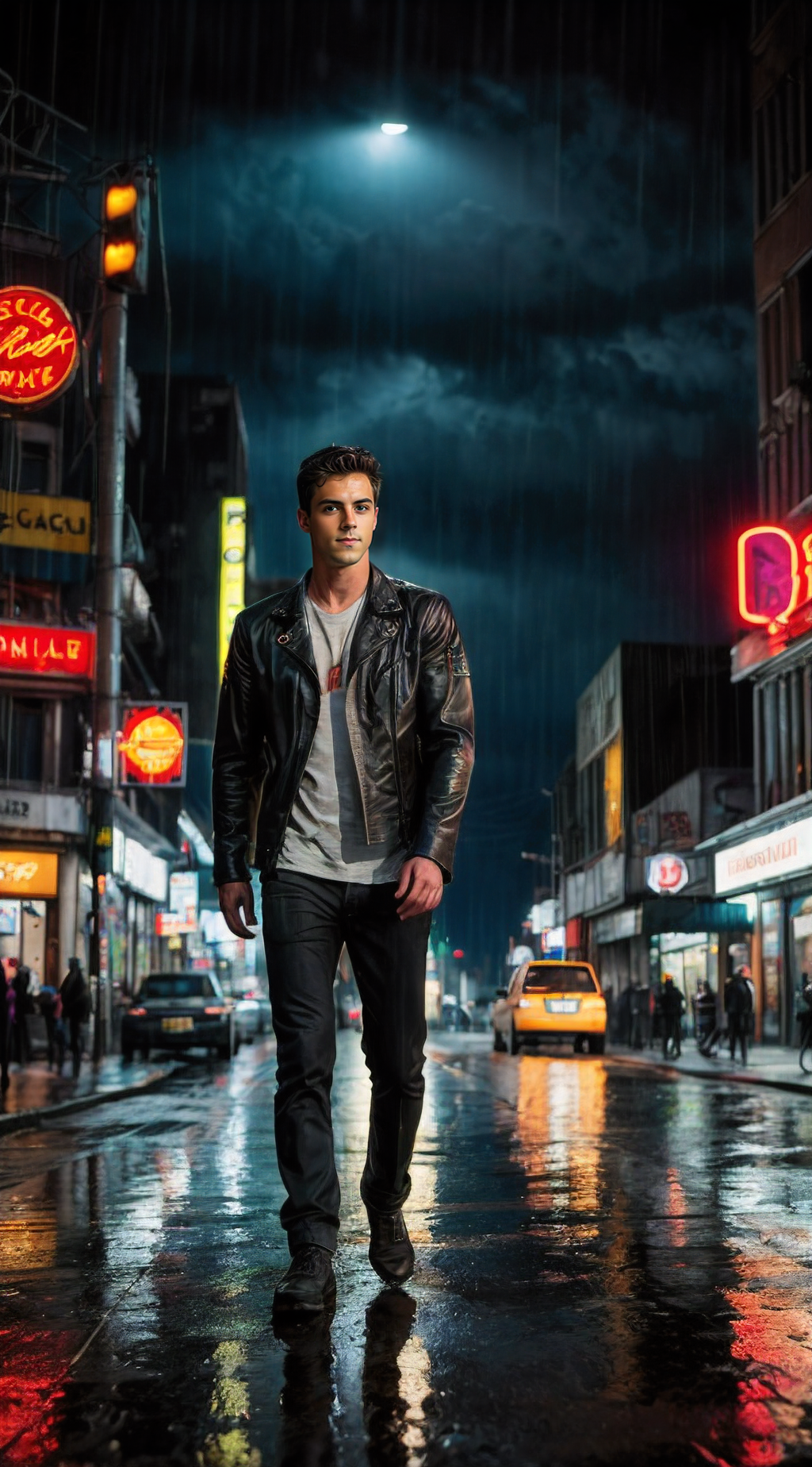Rugged man, cybernetic implants, neon-lit cyberpunk cityscape, intense gaze.