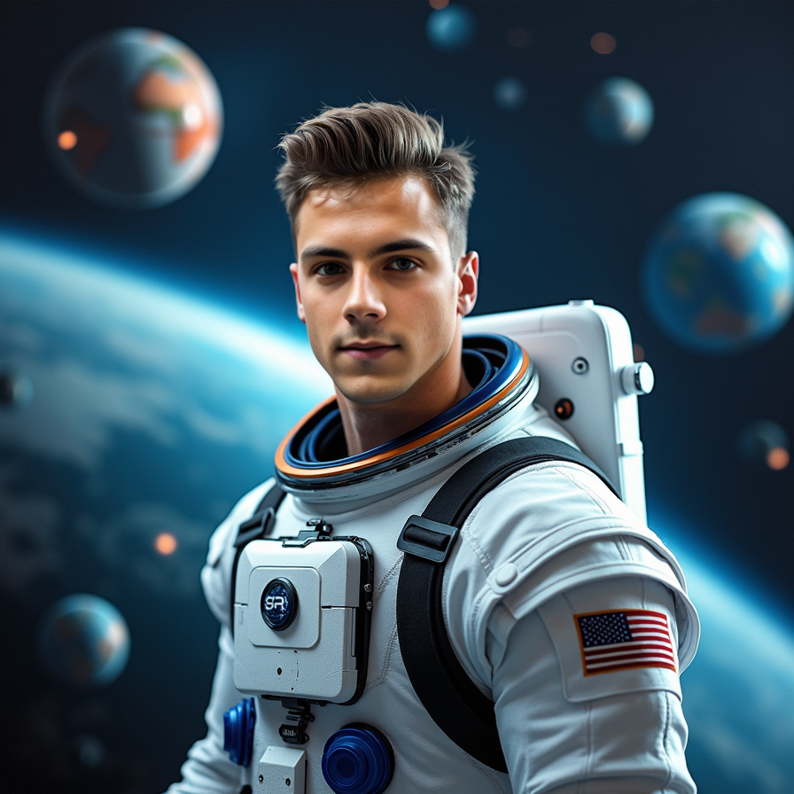 man in astronaut attire, surrounded by floating satellites and celestial bodies, against a stunning backdrop of Earth from space, with a sense of weightlessness and futuristic technology