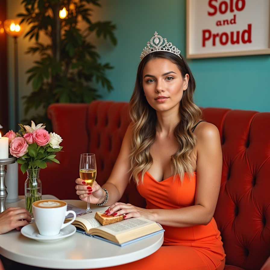 Sit at a cozy café table with a book, a latte, and a slice of cake. Look happy and content, enjoying your company.