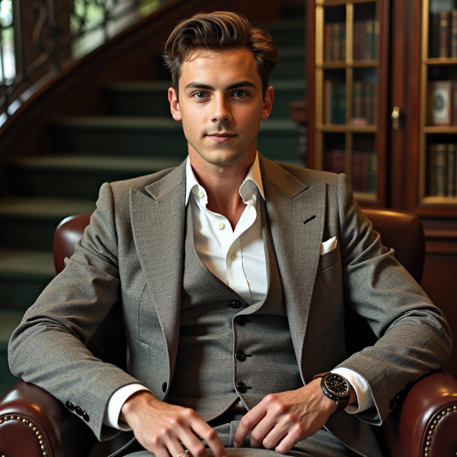 man with an aristocratic vibe. He is posed against a backdrop of a grand staircase or a lush, private estate. He is dressed in semi-formal attire, such as a blazer with an open-collared shirt, and his expression is calm and confident. The lighting should highlight his features and convey understated opulence