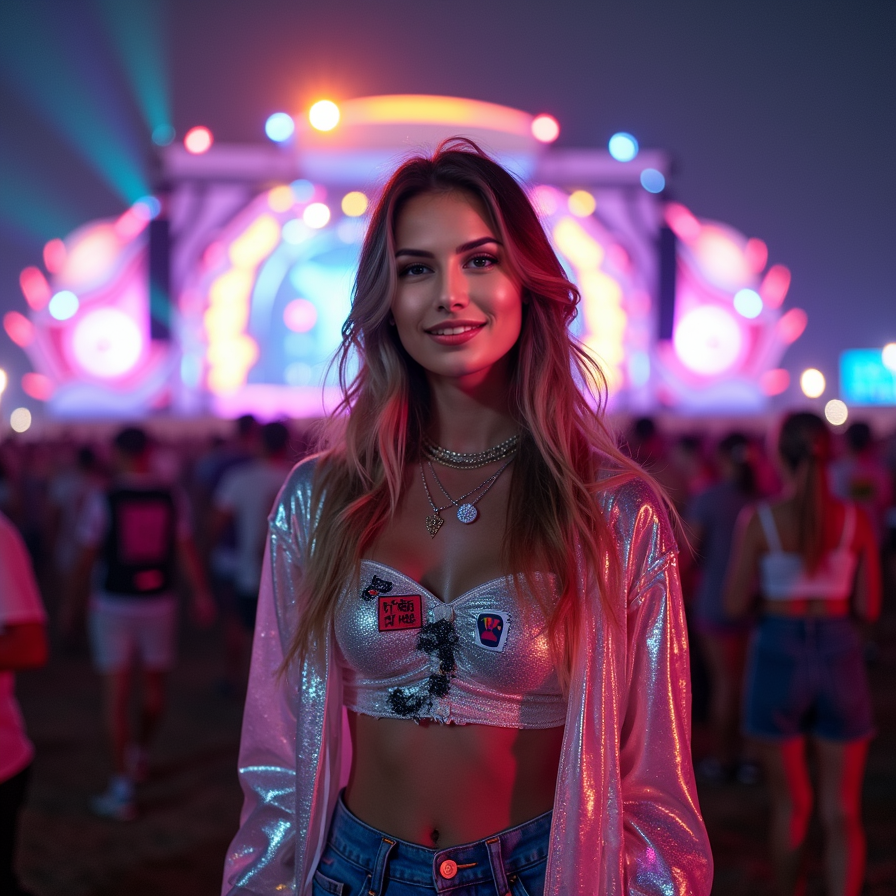 A woman with a radiant smile faces the camera at a massive music festival. She’s wearing a holographic jacket, glowing accessories, and metallic face paint. The background shows a huge, neon-lit stage with dynamic visuals and the crowd dancing in excitement. Bright lights, lasers, and bursts of color fill the night sky, adding to the enchanting festival atmosphere