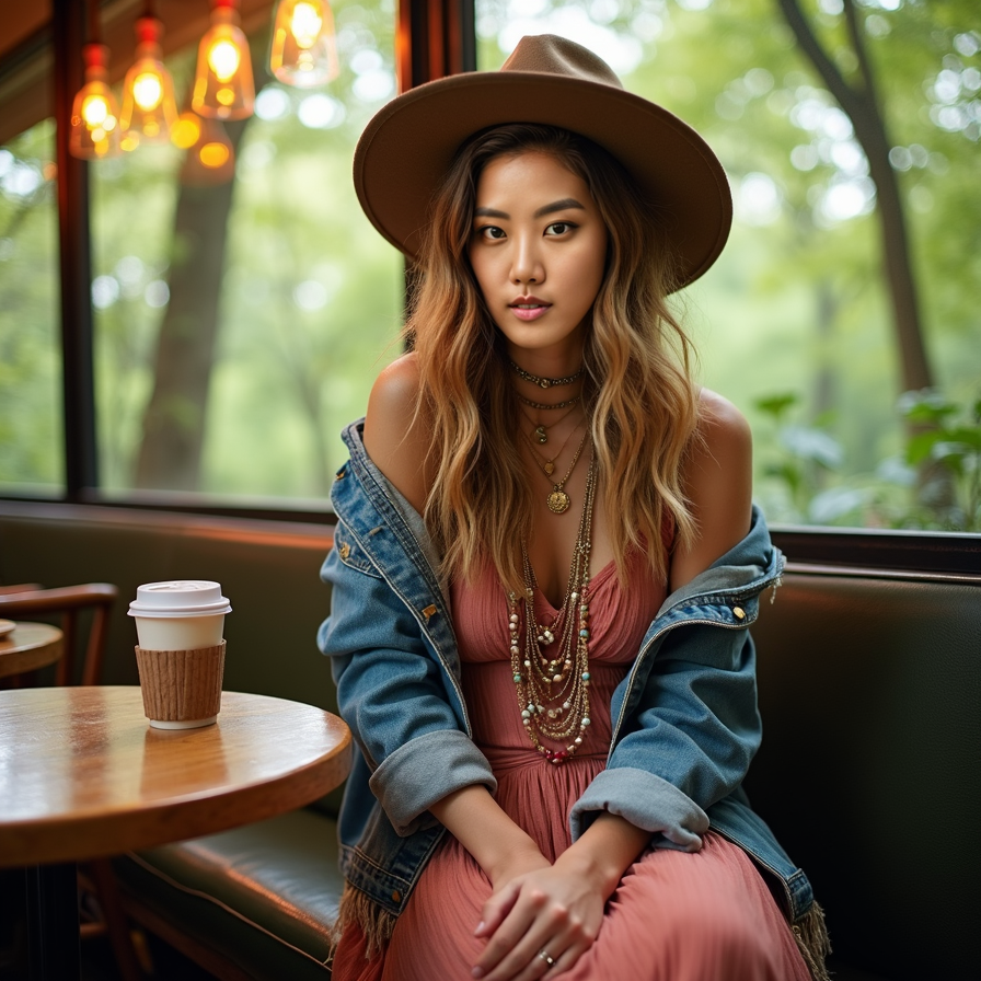 girl with casual attire, sitting in a trendy restaurant, surrounded by modern decor and vibrant lighting, with a cup of coffee or a delicious meal in front of her