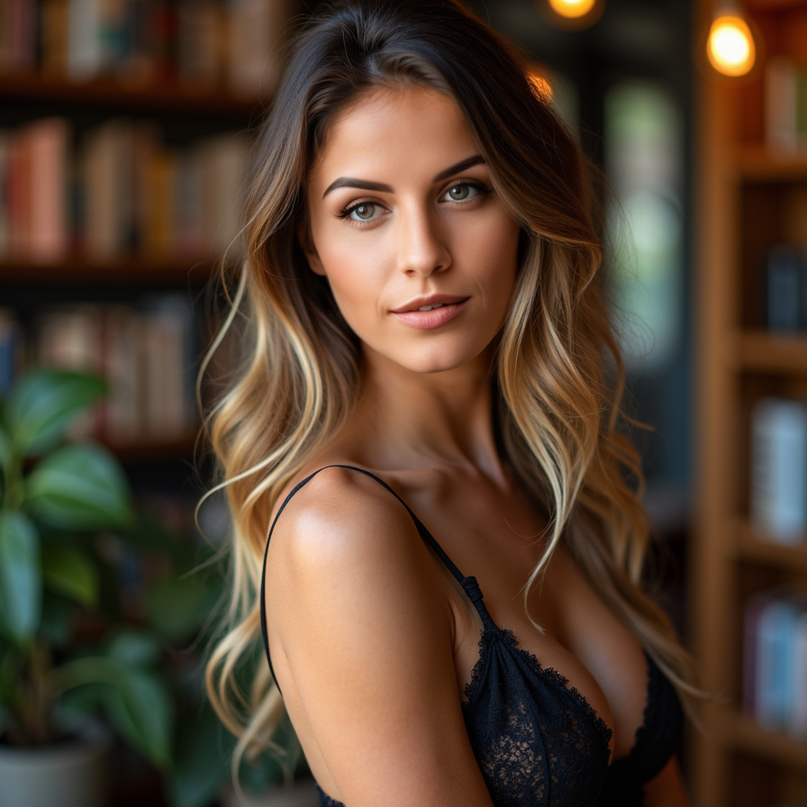 woman with a warm smile, set in a cozy indoor setting like a bookshop or sunny room. She is wearing stylish yet comfortable clothing, and the lighting is natural and inviting. The image should reflect authenticity and charm