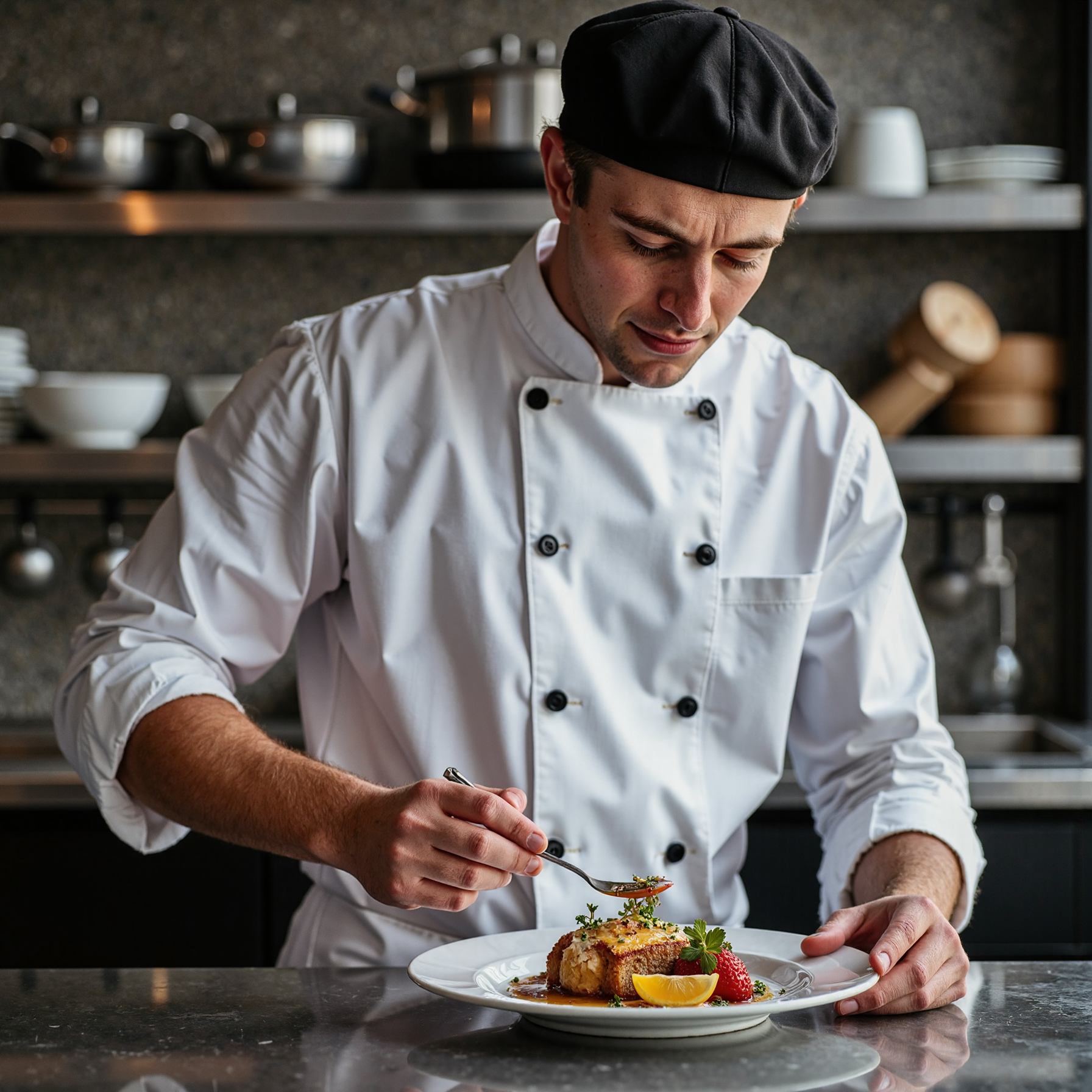 Highly detailed, highly realistic HDR portrait of a man chef in a spotless double-breasted cotton chef jacket with matte black buttons, sleeves neatly rolled; short trimmed beard, hair under black cap. Camera: 50mm lens, f/2.2, ISO 320, shot slightly above eye-level, waist-up angle to emphasize plated dish. Lighting: tungsten kitchen lights with softbox fill from camera left, gentle shadows to right; highlights glint…