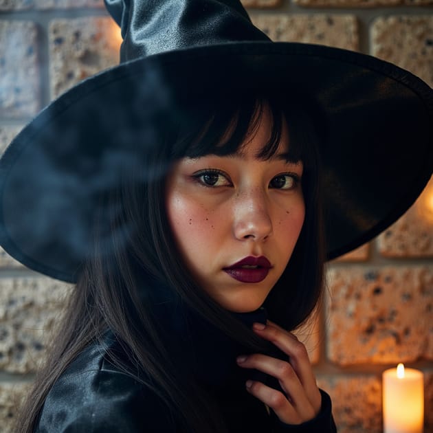 Gender: Female — Extreme close-up portrait of a witch-in-training; glossy black bob with blunt bangs tucked behind one ear, wisps of baby hair visible; skin texture shows fine pores, subtle peach fuzz, faint freckling over the nose; deep plum lipstick with micro-cracking; attire hints: charcoal felt witch hat edge and collar of matte velvet cloak with short pile and soft lint; camera angle eye-level, 85mm lens at…