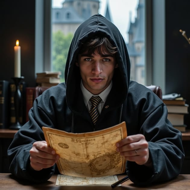 Hyper-realistic HDR close-up of a 17-year-old male Hogwarts student with pale skin, faint blue undertones under eyes from dim lighting, and an intense, focused gaze. Dark brown hair with a slight wave falling partially over his forehead, matte texture. Wearing a deep-black hooded robe pulled forward to shadow the upper face, only the tip of the nose and mouth fully lit. Pose: seated at a wooden desk, both hands delicately unfolding an aged parchment Marauder’s Map (visible creases, fiber texture, faint sepia ink). Camera: Nikon Z8, 85mm f/1.8 prime, aperture f/1.8, camera at slightly above hand height for immersive tabletop perspective. Lighting: single warm candle key light (2800K) to left casting deep, directional shadows across hands and parchment; subtle secondary cool fill (5600K) from unseen window gives slight edge highlight to hood; flame flicker creates moving micro-shadows across knuckles and page folds. Background: deep black vignette with barely visible shapes of stacked books, ensuring full focus on subject and map.