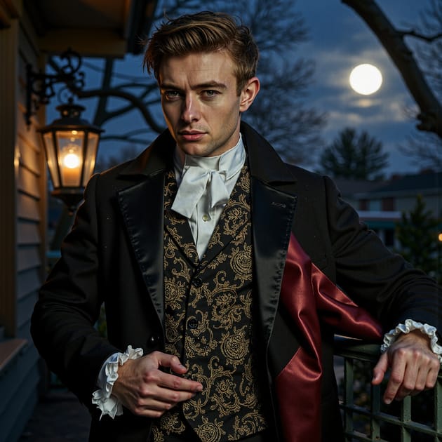 Mid-shot from a slightly low camera angle (50 mm, f/2, ISO 320, 1/160 s), framed so the horizon is below his shoulder line. The main key light is cold moonlight striking from the front-right at a 45° elevation, creating a sharp highlight along the cheekbone and casting a shadow from his nose diagonally toward his ear. A small practical lantern behind him acts as a rim light, catching the edges of his satin cape and…