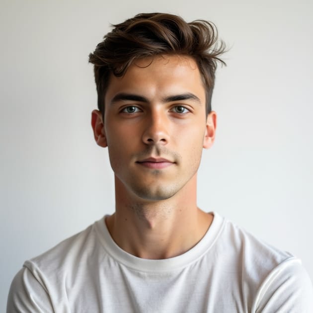 A passport-size photo of a young adult wearing a casual t-shirt, smiling subtly but neutrally. The background is plain white, and the lighting is soft and evenly distributed. The subject is centered, looking straight into the camera