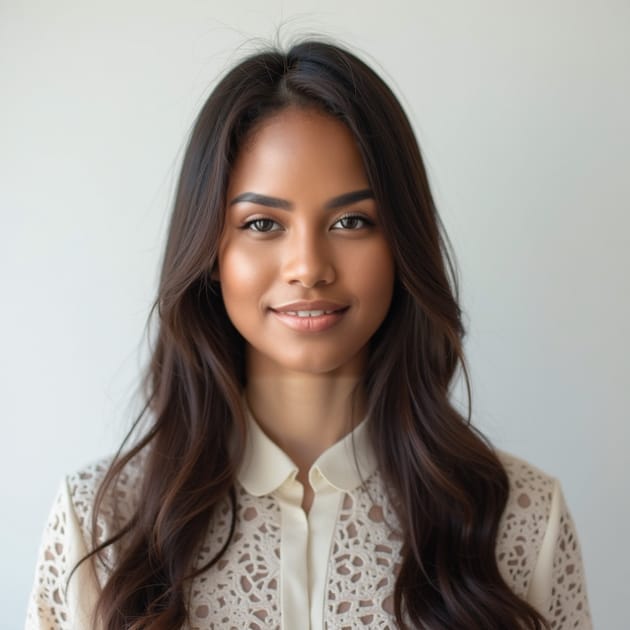 A passport-size photo of a person wearing traditional formal attire, with a neutral expression. The background is plain white, even lighting is used to eliminate shadows. The person is centered and looking directly at the camera