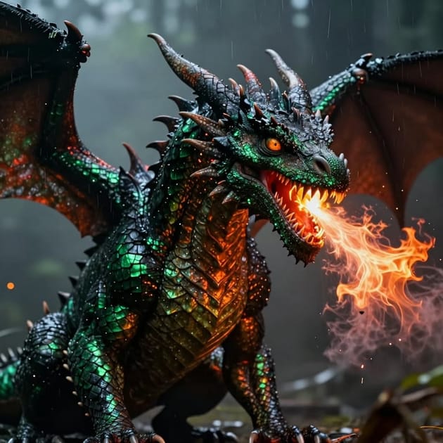 - Prompt: Create a hyper-realistic image of a fire-breathing dragon with an intense, piercing stare. Ultra-detailed scales, muscular frame, and blazing breath. Cinematic lighting, moody atmosphere, shallow depth of field, 8k realism. Add smoke, embers, and subtle rain-soaked textures on scales for depth. Vantage: three-quarter view, dramatic backlit rim light, high dynamic range. Color palette: dark emerald greens…