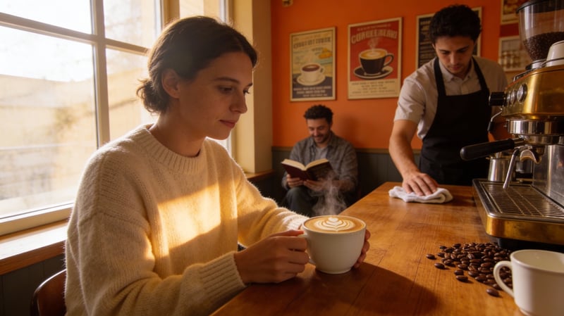 Morning coffee shop scene, barista pouring latte art, customers chatting in background,