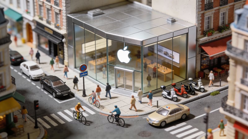 A dynamic aerial view of a bustling city street, focusing on a miniature [BRAND] store.