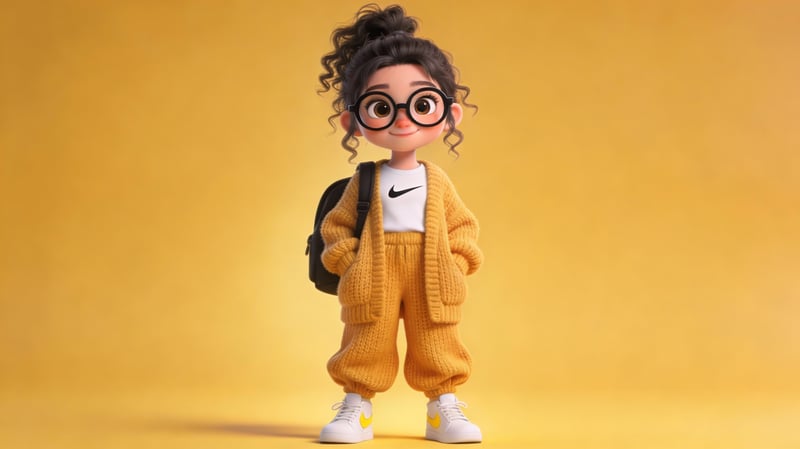 A cute 3D cartoon character of a young girl standing confidently,